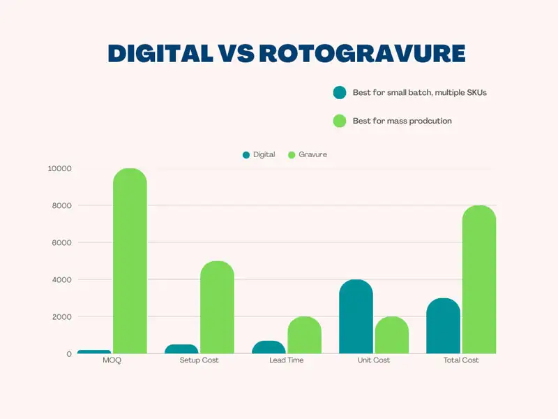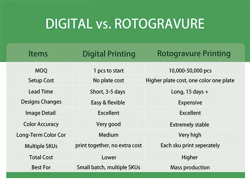 This article compares digital printing vs rotogravure printing for pouches in terms of cost, minimum order quantity (MOQ), lead time, and ideal use cases, helping you decide which solution fits your brand best.