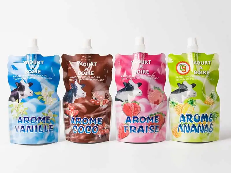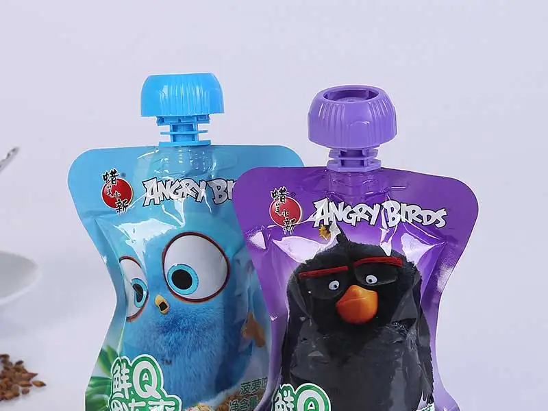 As bolsas de pé com bico é laminada pela estrutura PET/PE ou PET/AL/PE. Pode ser feito de 2 camadas, 3 camadas e outras especificações. Depende do pacote. É necessário aumentar a barreira de oxigênio para prolongar a vida útil do produto. ciclo. A embalagem flexível da bolsa de bico não é adequada para a embalagem de bebidas carbonatadas no momento, mas tem vantagens nos campos de suco, produtos lácteos, bebidas saudáveis e alimentos de geléia.
